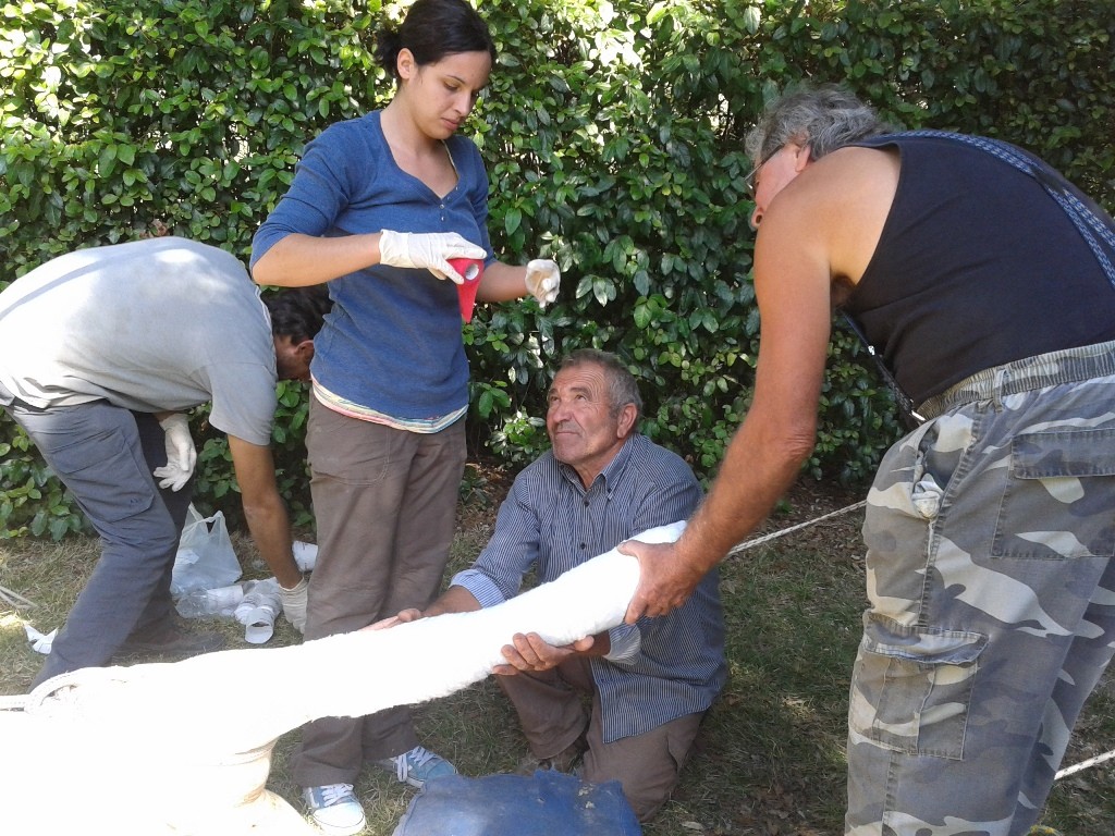 Io sono addetta al controllo della respirazione e alla regolazione dell’ anestetico. Sono molto impressionata perché la vitella a causa della posizione e dello stress si è gonfiata enormemente e ho paura che esploda il rumine… Appena il gesso si è consolidato si riparte per la stalla e riusciamo a sdraiarla ancora semi-incosciente sulla paglia fresca!